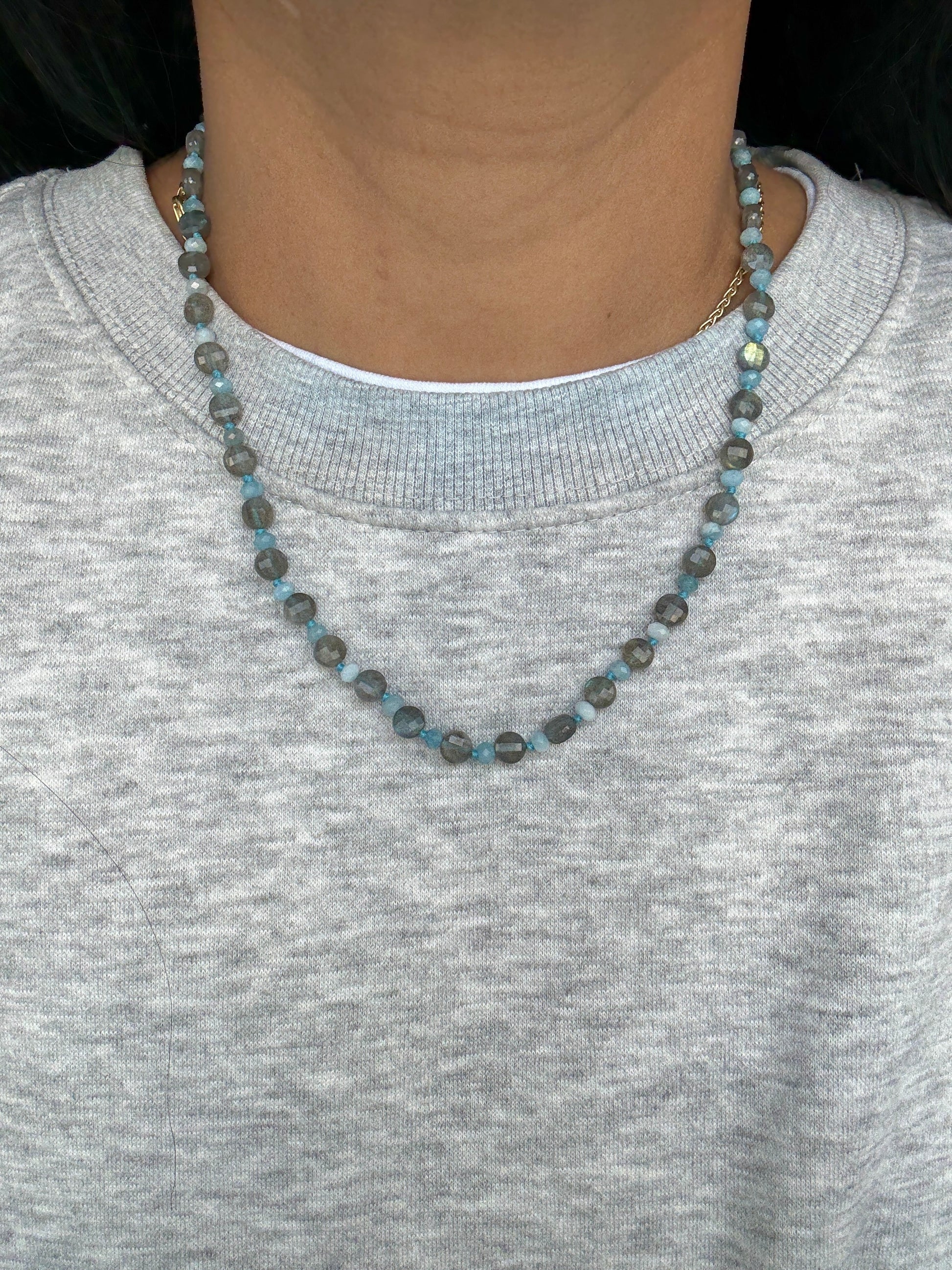 6mm faceted coin labradorite with 3mm x 4mm faceted aquamarine. The necklace can be worm both ways with the pebble drop worn as a pendant. The clasp and silver beads fittings are 925 sterling silver which are nickel free.
